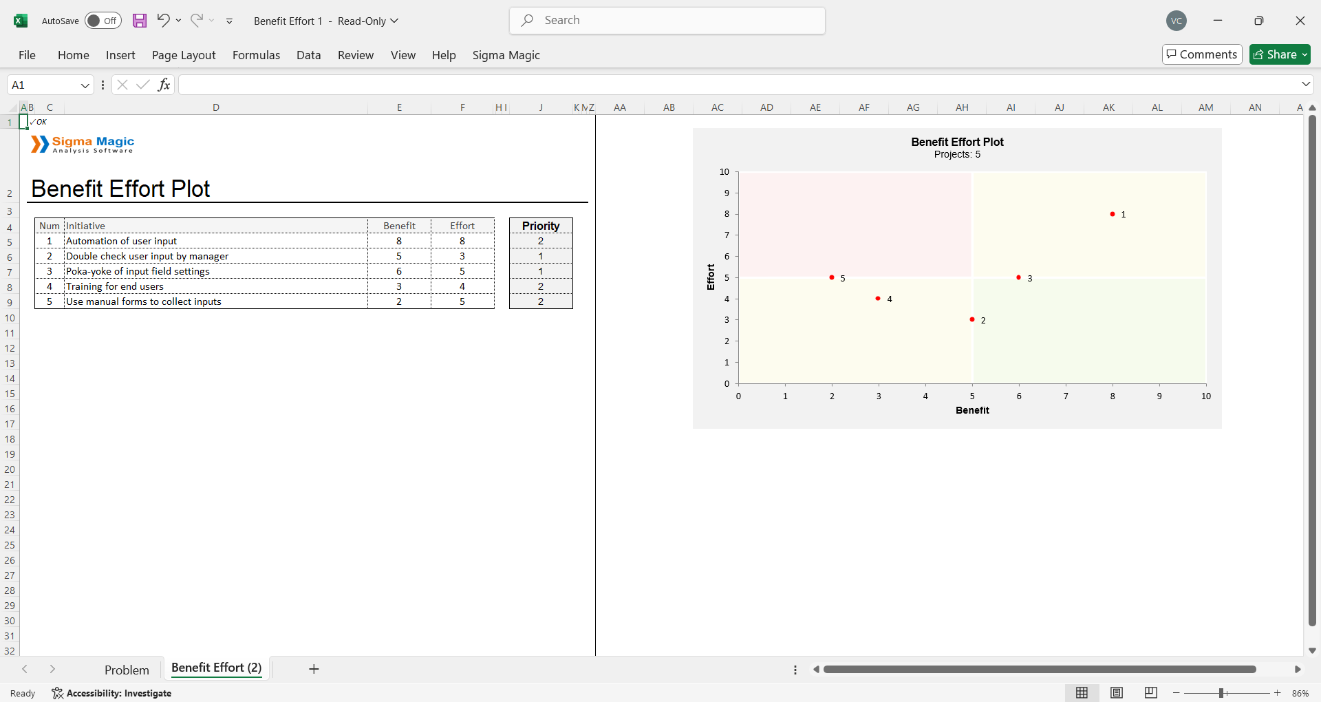 Priority Implications: The "Priority" column in your table generally aligns with the plot. Initiatives in the green zone (like "Automation") have the highest priority (1). Yellow zone projects have medium priority (2 and 3), and red zone projects have the lowest priority (4).