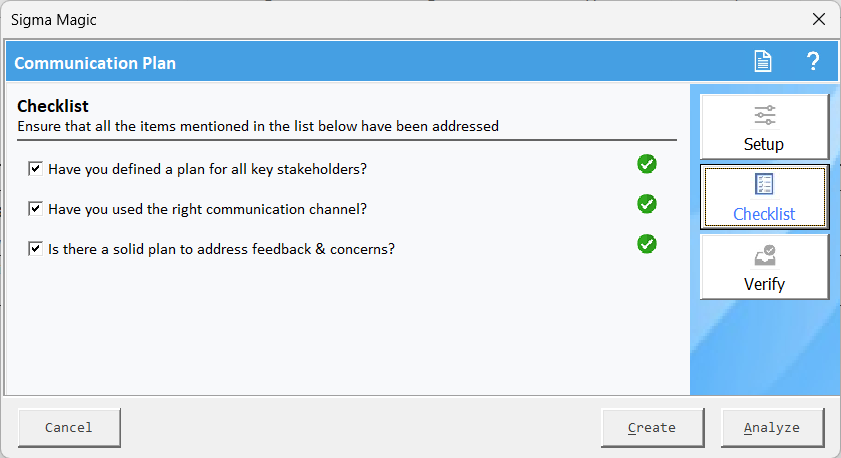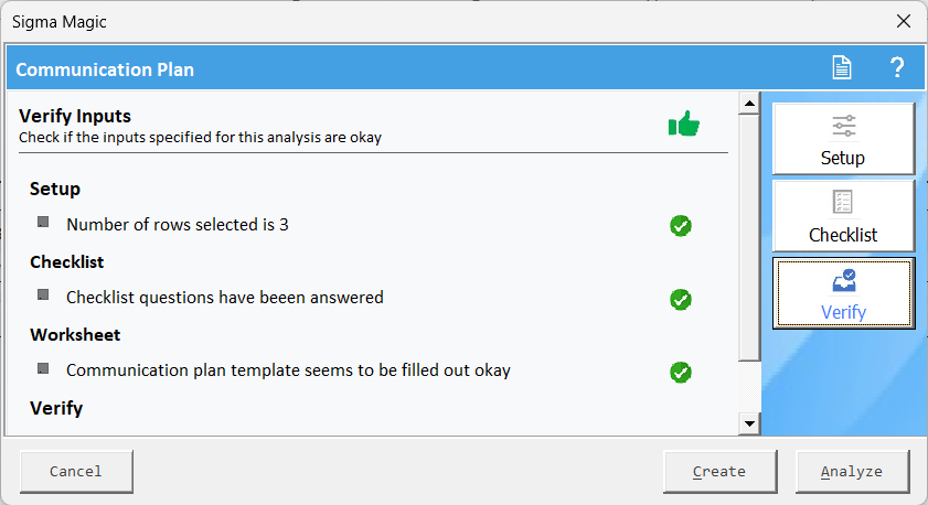 Finally, click on Verify and then click Analyze tab to ensure all the inputs are okay and shown in a green checkmark.
