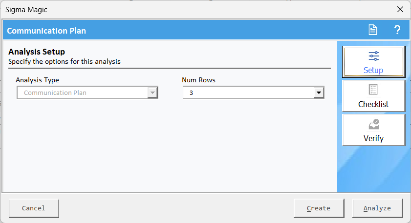 A new worksheet will be added to your workbook.Analysis Setupwill be automatically opened, in the setup tab specify the following details.