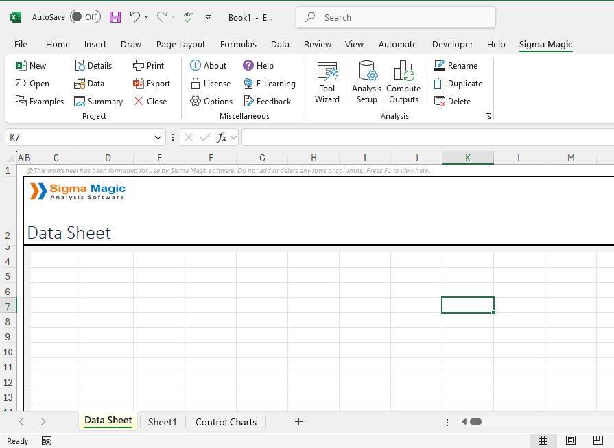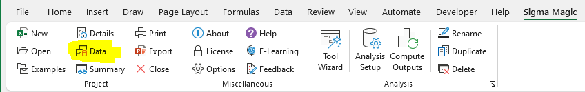This will add a new worksheet for you in the current workbook. Sigma Magic only has one Data Sheet for each project. So, if you click on the Data button again, it will not create a new Data Sheet for you but will take you to the existing Data Sheet. You can use this button to quickly move between your analysis worksheet and the data sheet.