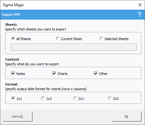 You can specify which sheets you want to export from Excel to PowerPoint. The default is to export all the sheets. Select the currently active worksheet or specify the sheets you want to export.