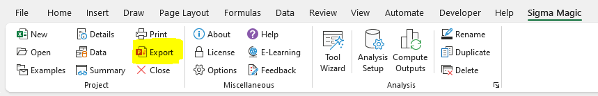 The software is an add-in within Microsoft Excel. When you open Microsoft Excel, you should see the software on the main menu bar. Click on the Sigma Magic button to load the software into memory. This will open the Sigma Magic menus as shown in the ...