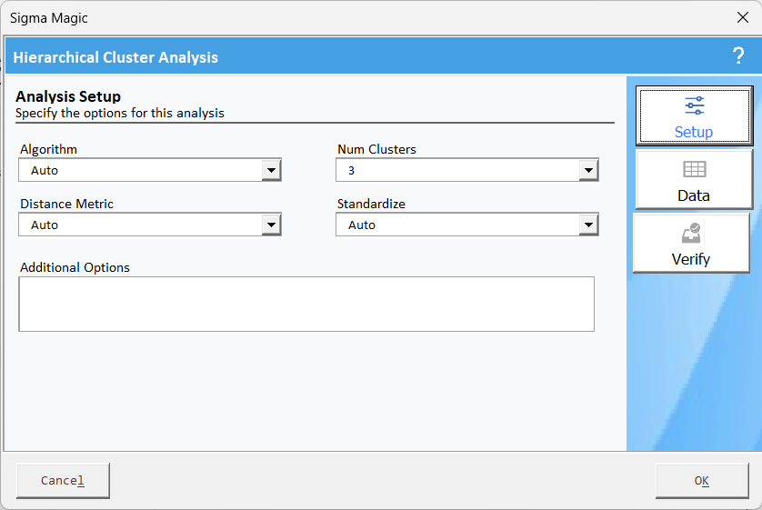 A new worksheet will be added to your workbook. Analysis Setup will be automatically opened, in the setup tab specify the survey results.