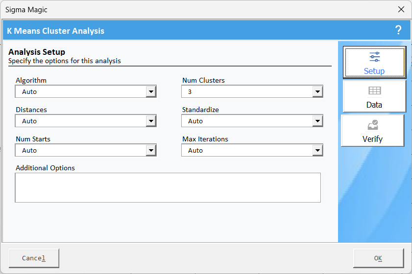 A new worksheet will be added to your workbook. Analysis Setup will be automatically opened, in the setup tab specify the survey results.