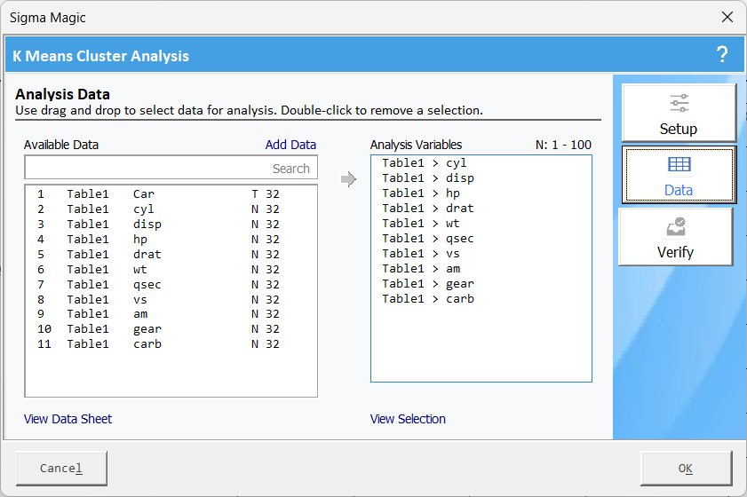 Problem Statement We have collected data on several different models of cars with respect to several parameters. Create a dendogram that displays the hierarchical relationship between the vehicles. How to perform analysis Step 1: Open Sigma Magic ...