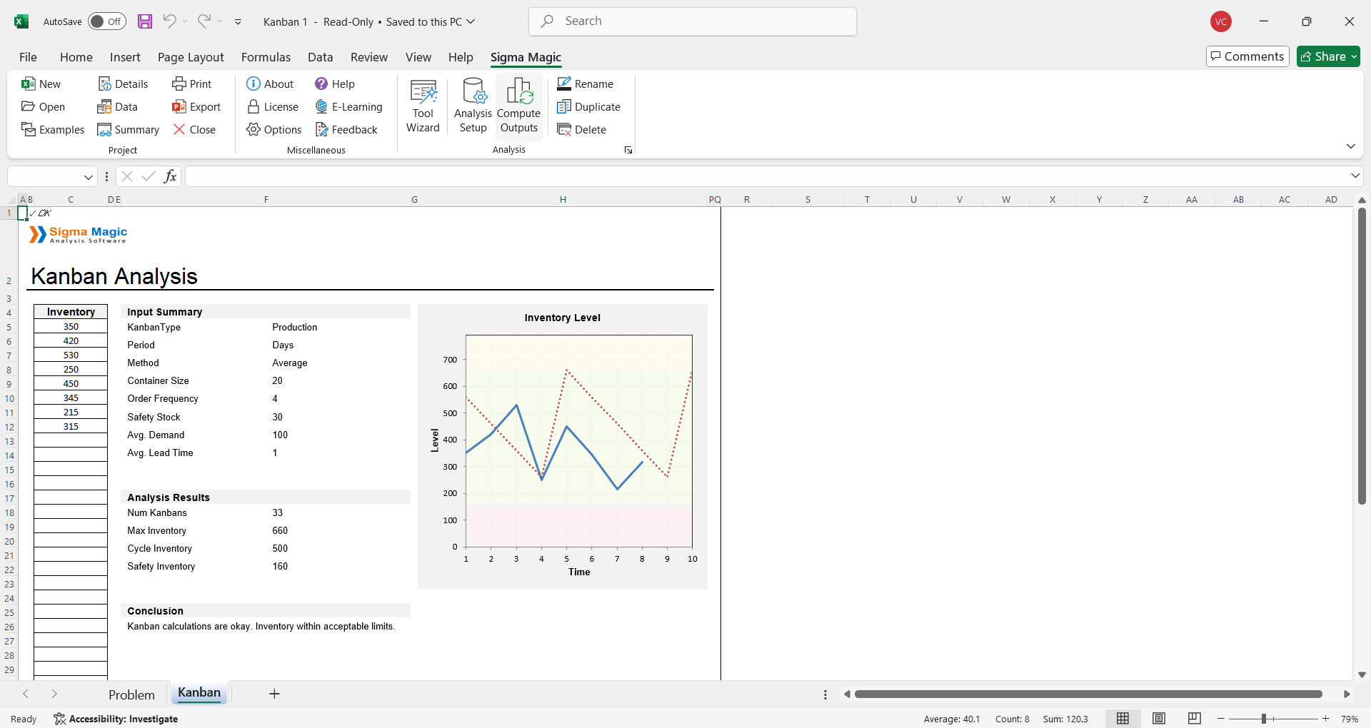 - The number of calculated Kanbans is 33 to ensure that inventory levels are properly maintained without getting below the level of safety stock or going over the maximum inventory capacity.