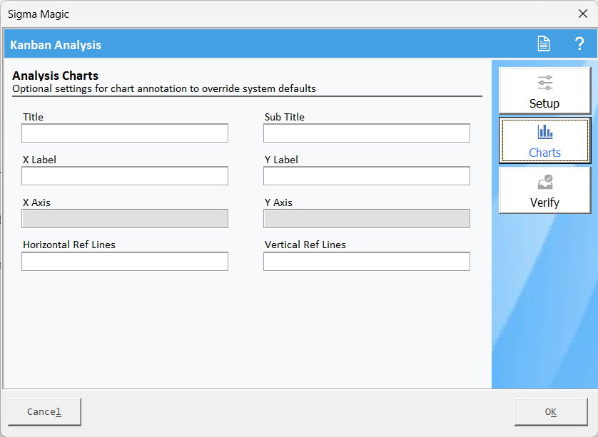 If you need to make changes to the charts, click on the Analysis Setup and then the Charts tab. You can specify the following details,