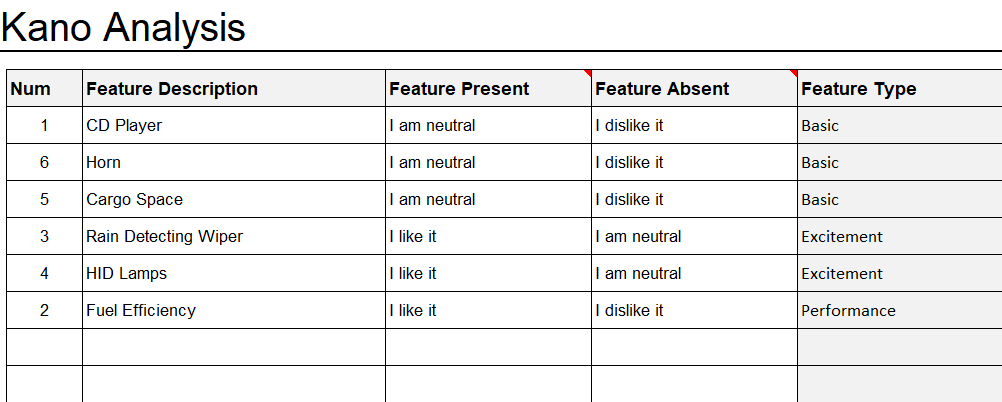 - Basic Features (Need-Be) Don't Matter Much: Basic need features such as CD Player, Horn, and Cargo Space can be included here. Its absence does not provoke the customers' interest but presence may result in dissatisfaction.