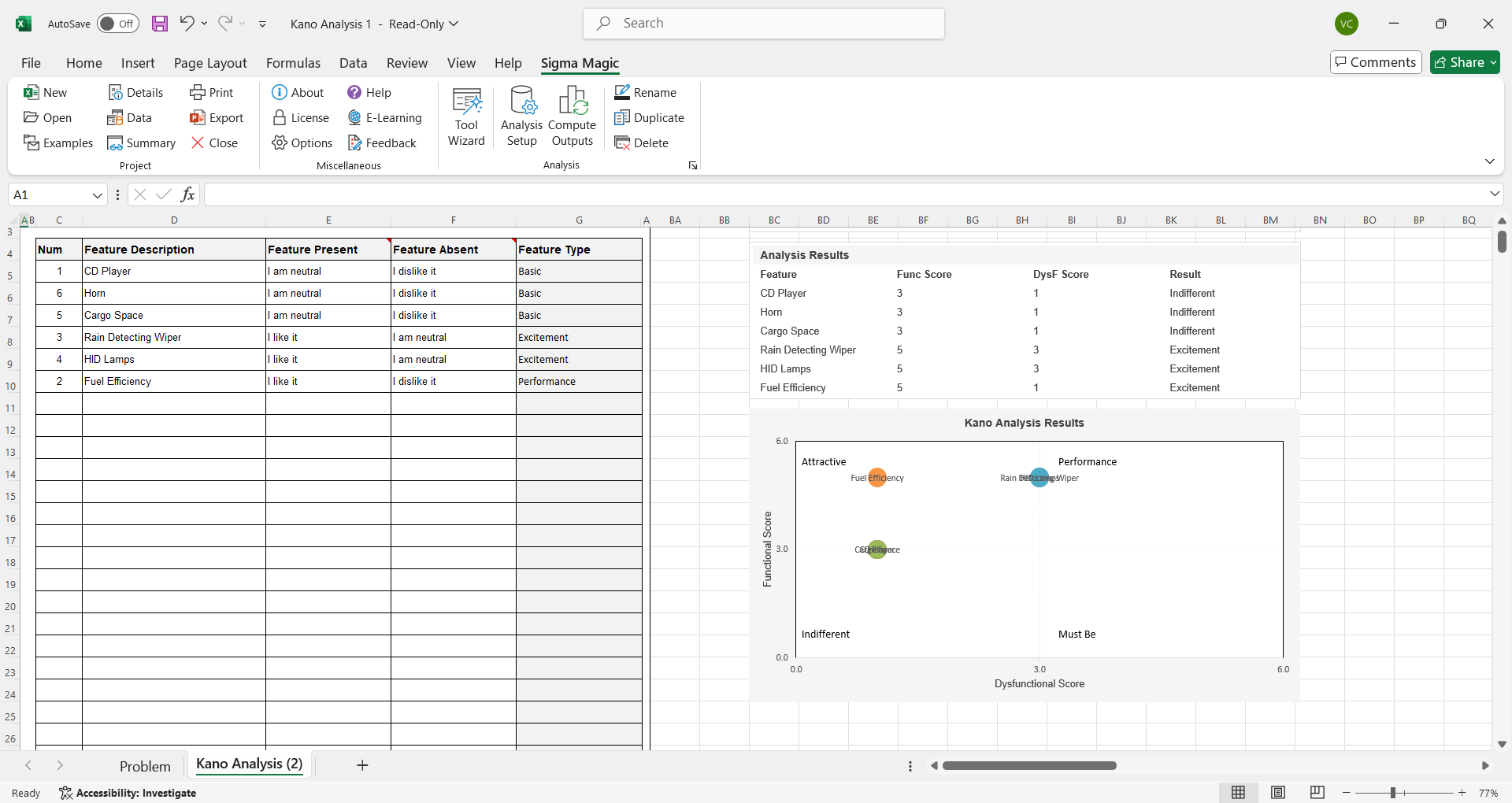 Select a few features on an automobile and perform the Kano analysis. Determine basic, performance, and excitement features