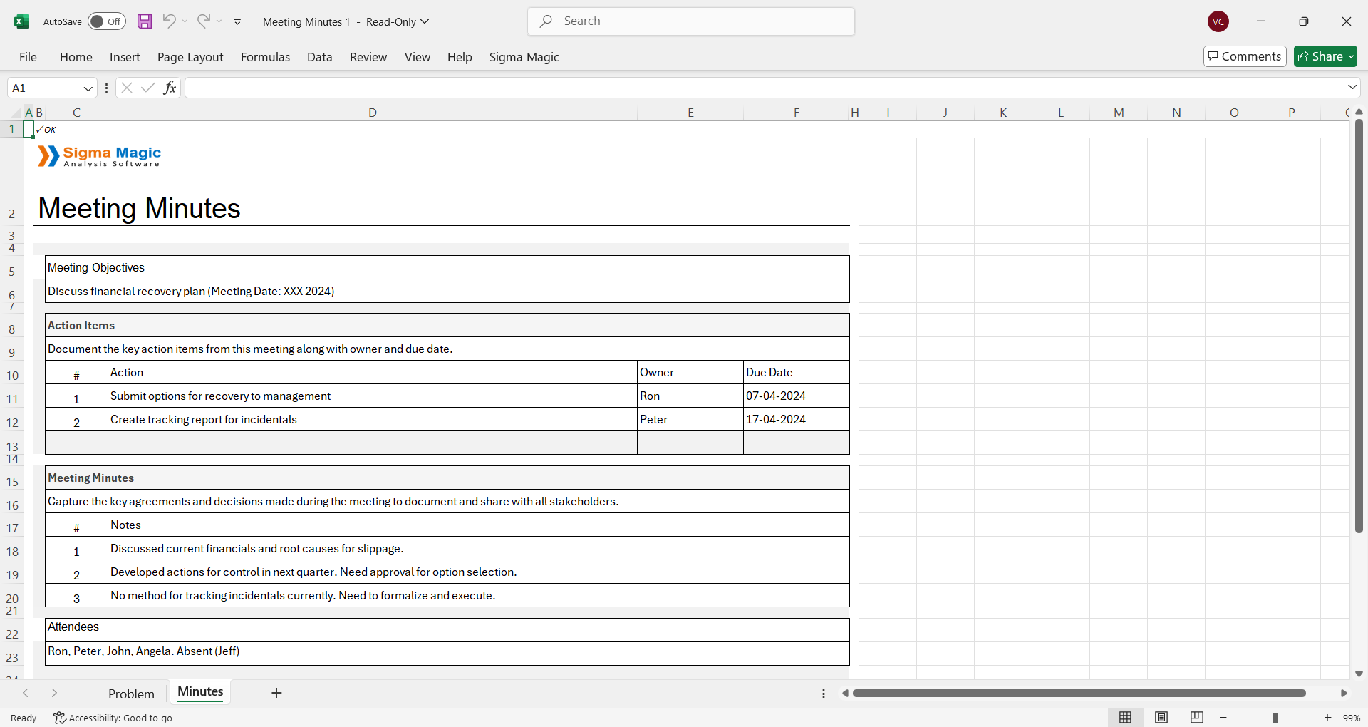attendees list includes Ron, Peter, John, and Angela, with Jeff absent.