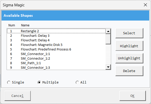 Click on the My Shapes button to view the shapes on your worksheet. This dialog box can delete any stray or duplicate shapes you inadvertently created. You can also highlight or unhighlight portions of the map using this dialog box. A sample screenshot is shown below.
