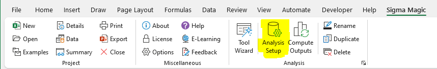The software is an add-in within Microsoft Excel. When you open Microsoft Excel, you should see the software on the main menu bar. Click on the Sigma Magic button to load the software into memory. This will open the Sigma Magic menus as shown in the ...