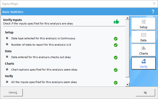Verify: This tab lets you verify is you have correctly specified the analysis options. If there are any errors, it will be shown here before you perform the analysis. In this example, all the inputs seem to be okay.