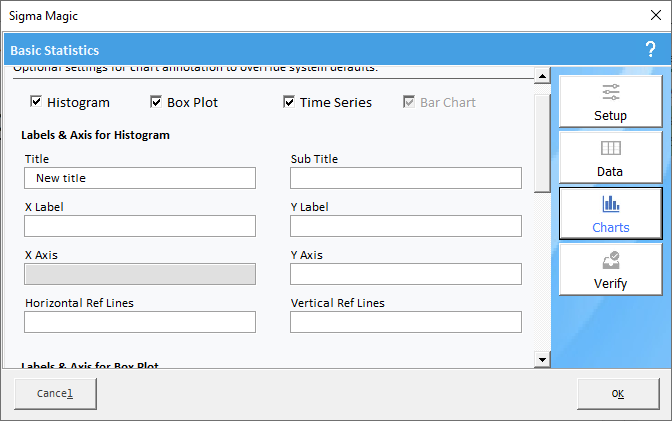 Charts: This tab allows you to specify the options for the charts. This is optional and can be used to override the defaults specified by the software. Here, you can change the title, subtitle, the axis labels, limits, and add horizontal and vertical lines.