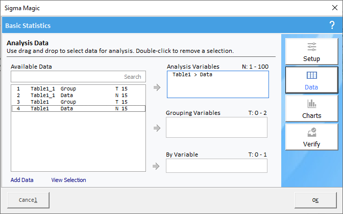 Data: This tab allows you to select the data that you want to analyze. The left section of this dialog box contains the list of available data, and the right section contains the selected data for analysis. Drag and drop the requisite data for analysis. Note that there are three data that be specified. The analysis variable, the grouping variable, and the by variable.