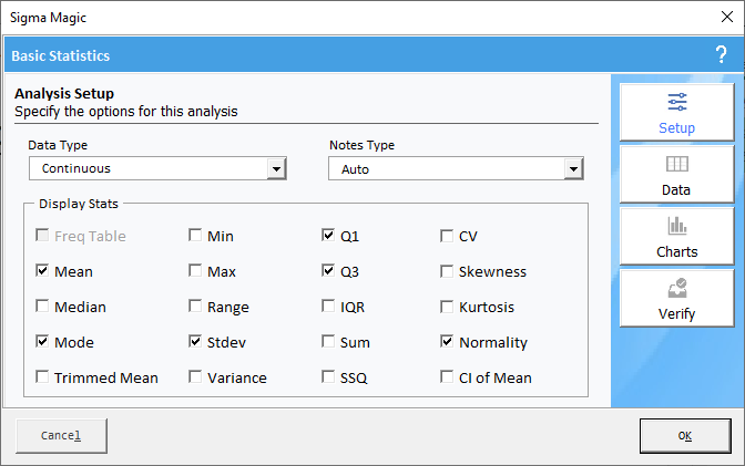 Depending on the worksheet that is currently active, the analysis setup will be displayed for that worksheet. For example, if you have the Basic Stats worksheet active, then the following analysis setup dialog box is displayed.