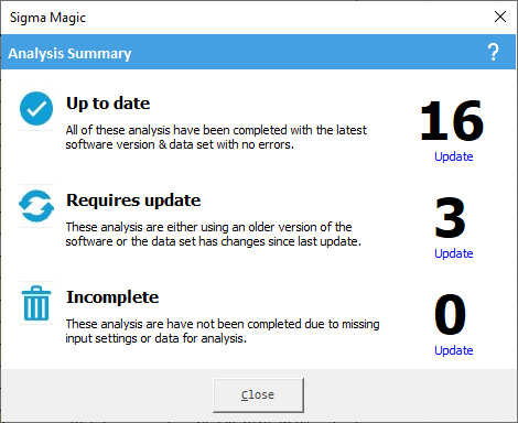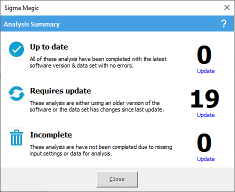 This dialog box shows that 19 analyses require an update. Click on the Update link, and all the analyses will be updated. The results of the updated summary sheet is shown below.