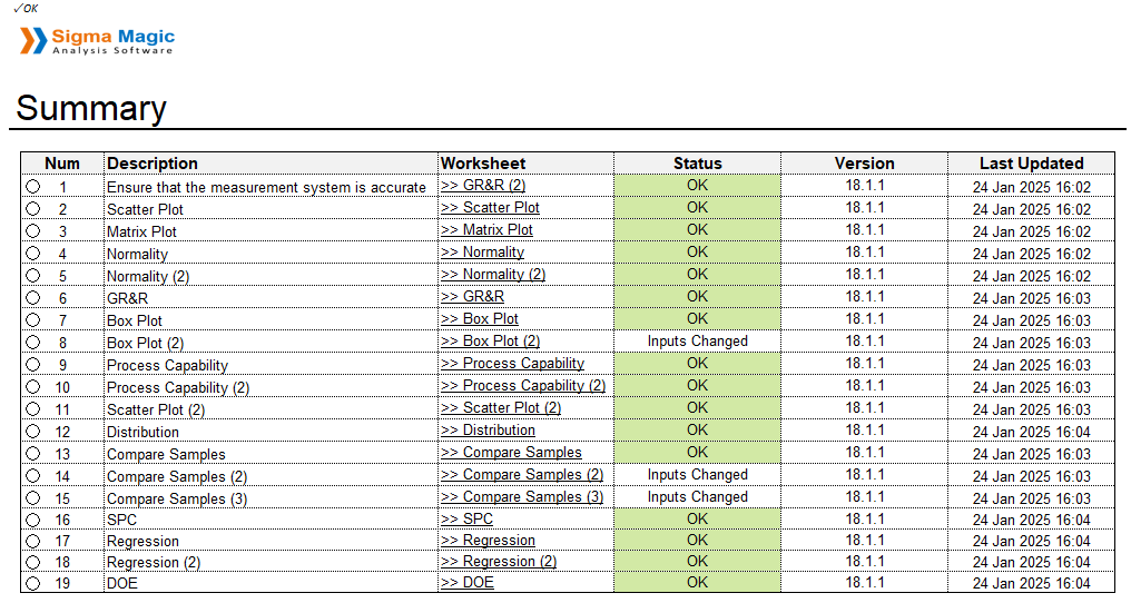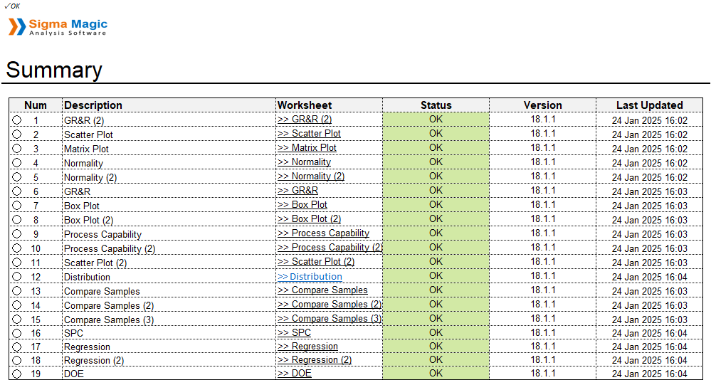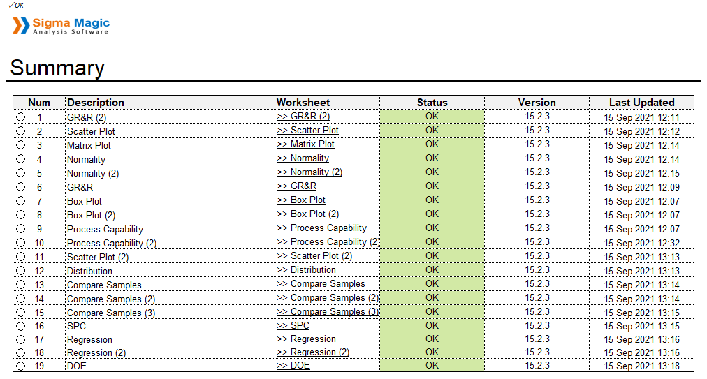 The summary sheet lists all the analyses you have performed in your project. In the above example, 19 different studies were conducted. The names of each analysis are shown in the Description column. The Worksheet contains a link to the analysis sheet. You can click on this link to take you to that worksheet. You can click the Summary button to return to the summary sheet. The Status column shows the status of each analysis. The version column shows the software version used to generate the analysis results, and the Last Updated column shows the date/time the analysis was completed.