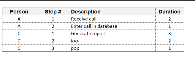 Create a workload balance study for the following data given. The TAKT Time for this exercise is 3 min.