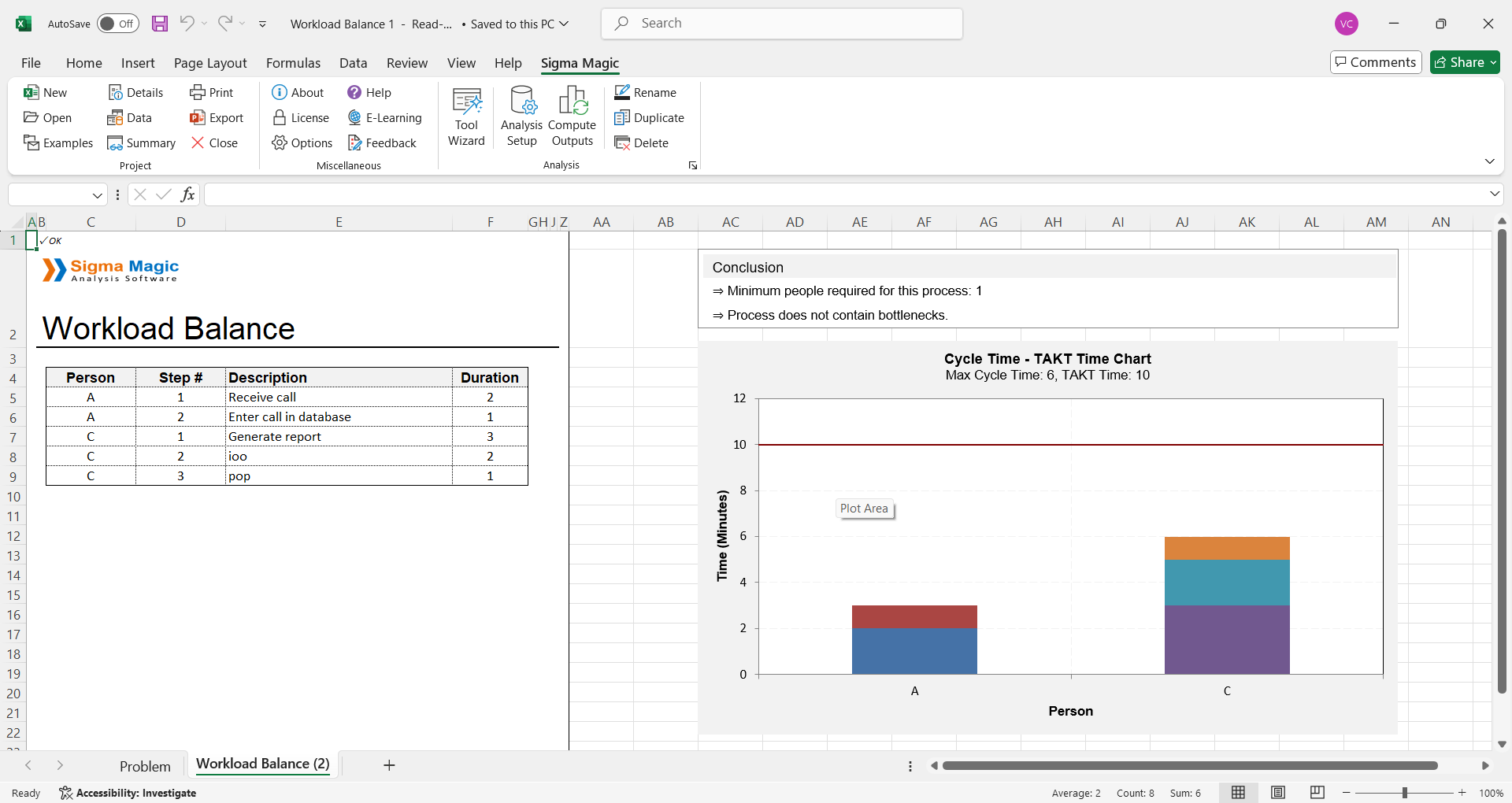 Cycle Time - TAKT Time Chart:The Max Cycle Time being 6 and TAKT Time being 10 shows that it can meet demand. TAKT Time means the available time to produce each unit of the customer's demand. Since Max Cycle Time is less than the TAKT Time, in theory, the process would be able to produce more units than the quantity demanded.